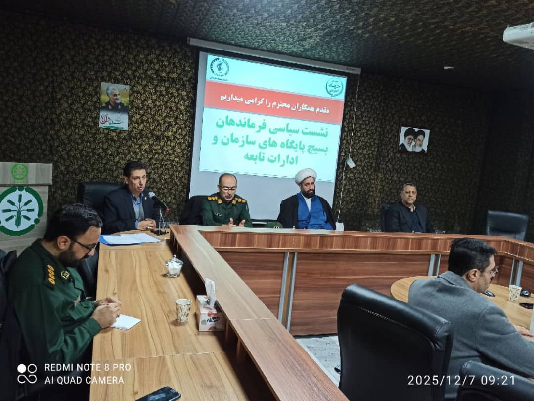 نشست سیاسی فرماندهان بسیج پایگاه های سازمان جهاد کشاورزی آذربایجان غربی نشست سیاسی فرماندهان بسیج پایگاه های سازمان جهاد کشاورزی آذربایجان غربی و ادارات تابعه با حضور جمعی از مسئولان و مدیران استانی برگزار شد. 1404/9/17 (9) (0) نشست سیاسی فرماندهان بسیج پایگاه های سازمان جهاد کشاورزی آذربایجان غربی به گزارش روابط عمومی مرکز تحقیقات آرتمیای کشور، یکشنبه 16 آذرماه 1404 با هدف هماهنگی و هم افزائی نشست سیاسی فرماندهان بسیج پایگاه های سازمان جهاد کشاورزی آذربایجان غربی و ادارات تابعه با حضور علی نکوئی فرد رئیس مرکز تحقیقات آرتمیای کشور و فرمانده پایگاه مقاومت شهید موسوی و جمعی از مسئولان و مدیران استانی در محل شرکت خدمات حمایتی کشاورزی استان آذربایجان غربی برگزار شد. در این نشست بر اهمیت نقش بسیج در تقویت روحیه جهادی و خدمت رسانی به مردم تاکید و ضرورت هم افزایی میان نیروهای بسیجی و دستگاه های اجرایی برای ارتقاء بخش کشاورزی تاکید و مسائل روز منطقه ای و بین المللی و جنگ 12 روزه مور تحلیل قرار گرفت.