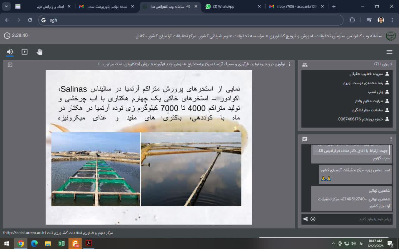برگزاری "نشست تخصصی بیوتکنولوژی و کاربرد آن در آبزیپروری" توسط مرکز تحقیقات آرتمیای کشور نشست تخصصی بیوتکنولوژی و کاربرد آن در آبزیپروری بهصورت حضوری و وبیناری در مرکز تحقیقات آرتمیای کشور با همکاری بخش زیستفناوری مؤسسه تحقیقات علوم شیلاتی کشور برگزار شد. 1404/10/16 (26) (0) برگزاری "نشست تخصصی بیوتکنولوژی و کاربرد آن در آبزیپروری" توسط مرکز تحقیقات آرتمیای کشور به گزارش روابطعمومی مرکز تحقیقات آرتمیای کشور، شنبه ۲۹ آذرماه ۱۴۰۴ به مناسبت گرامیداشت هفته پژوهش و در راستای سیاستهای مؤسسه تحقیقات علوم شیلاتی کشور و باهدف بهرهبرداری بهینه از ظرفیتهای تولید زیستفناوری و استفاده از منابع موجود در حوضه دریاچه ارومیه "نشست تخصصی بیوتکنولوژی و کاربرد آن در آبزیپروری و امکانسنجی بهرهبرداری از منابع زیستی دریاچه ارومیه با محوریت استخراج و استفاده از فرآوردههای آن" با سخنرانی محقق فعال در این زمینه و شرکت حضوری و برخط ۷۰ نفر، توسط مرکز تحقیقات آرتمیای کشور و بخش زیستفناوری مؤسسه تحقیقات علوم شیلاتی کشور انجام گرفت. در این نشست تخصصی رامین مناف فر عضو هیئتعلمی دانشگاه ارومیه، در زمینه " امکانسنجی استخراج فرآوردههای باارزش زیستی دریاچه ارومیه و جلبکهای دریاچه ارومیه، از چالش تا فرصتهای اقتصادی " را ارائه کرد. در پایان نشست طی پرسشوپاسخ به سؤالات شرکتکنندگان توسط سخنرانان پاسخ لازم ارائه داده شد.
